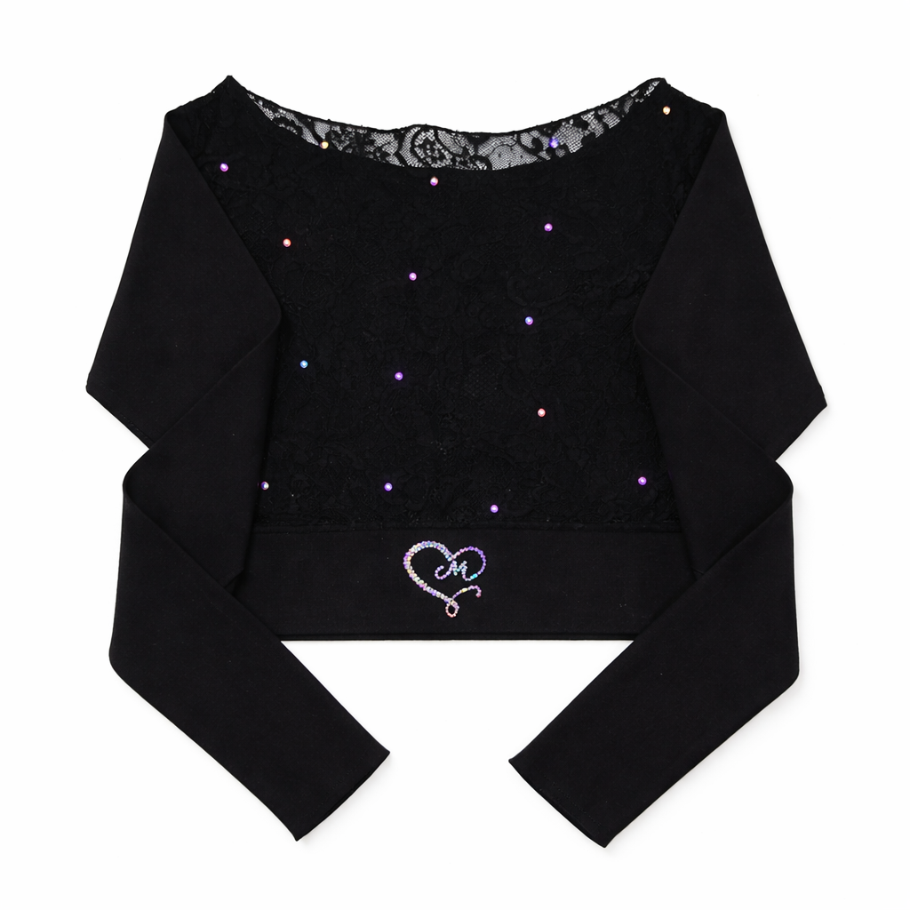 Das Set besteht aus einem kurzen Langarmshirt mit zarter Spitze am Rücken, einem passenden Trägertop und einer hochelastischen Trainingshose. Der Spitzeneinsatz ist dezent mit verstreuten Kristallen verziert, die für einen raffinierten Glanz sorgen und gleichzeitig einen gepflegten, professionellen Trainingslook gewährleisten.