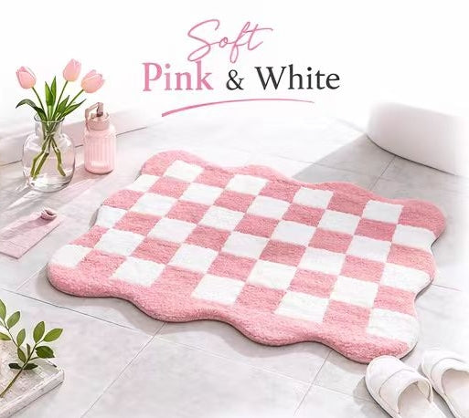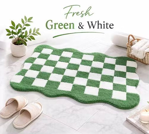 Add a stylish touch to your bathroom with this luxurious black and white checkered velvety bath mat. Crafted from high-quality, plush material, this bath mat is designed to offer both comfort and modern aesthetics. Its soft texture provides a cozy feel underfoot, while the non-slip backing ensures safety and stability. The unique scalloped edges give it a playful yet contemporary vibe, making it an ideal addition to any bathroom. Whether you're looking to refresh your space or enhance your bathroom's décor, this rug is a perfect choice for both style and function.