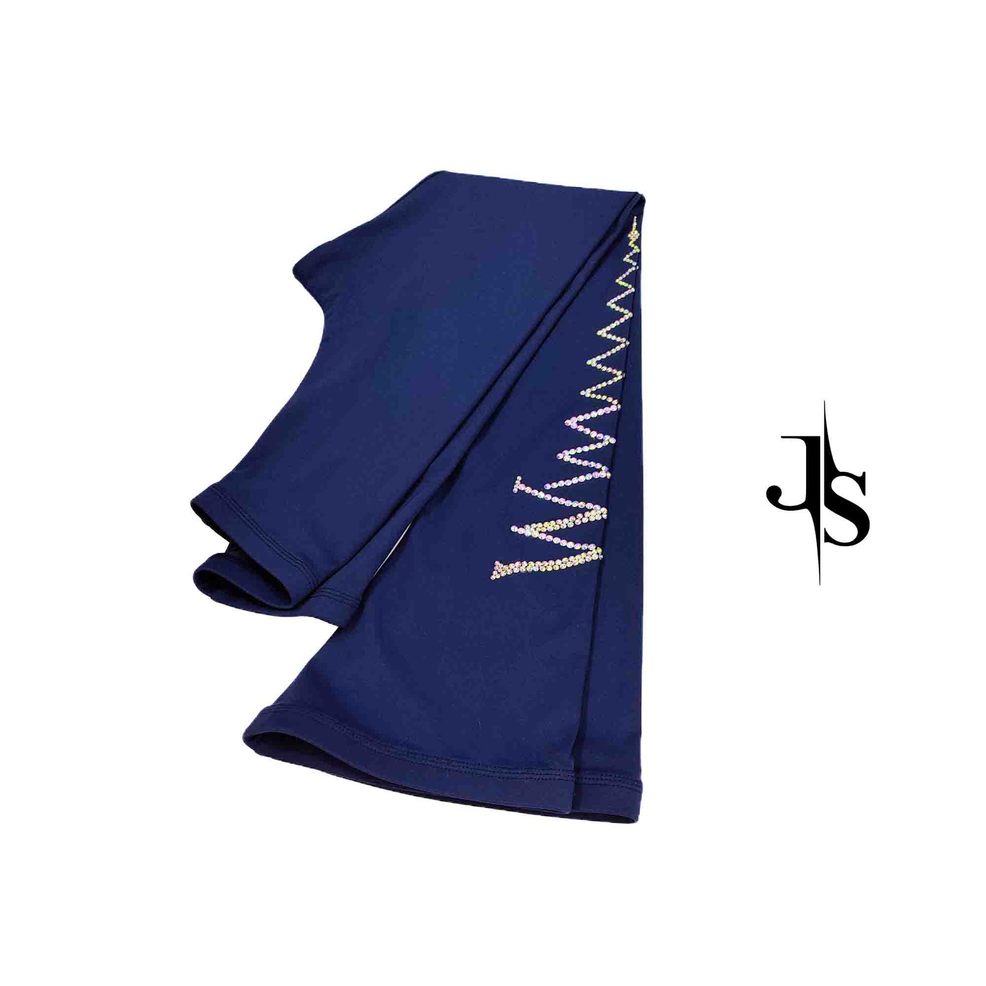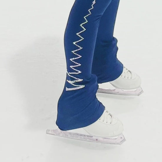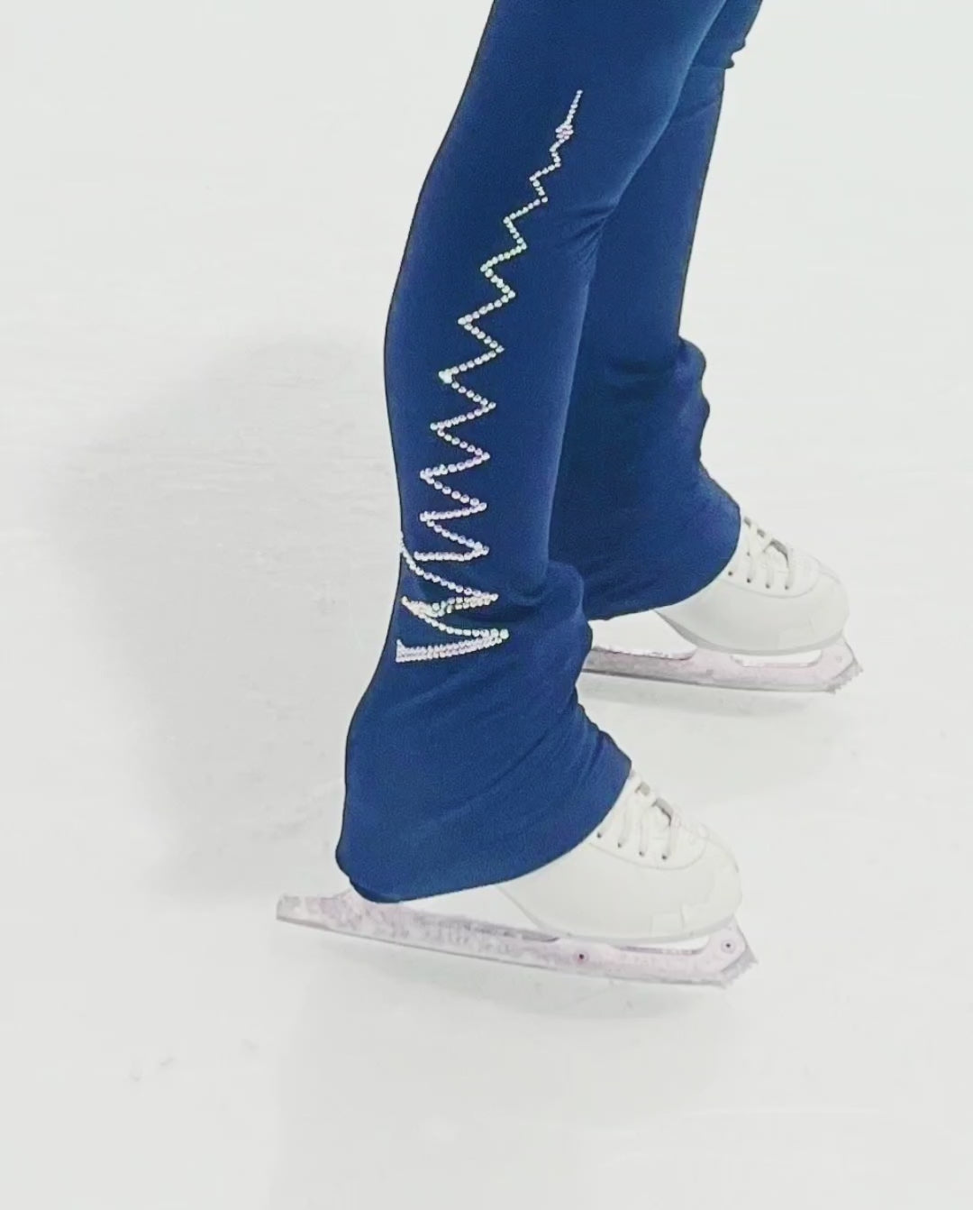 These custom figure skating pants feature a personalized crystal design on the calf, created from the skater’s initial for a unique and elegant touch.