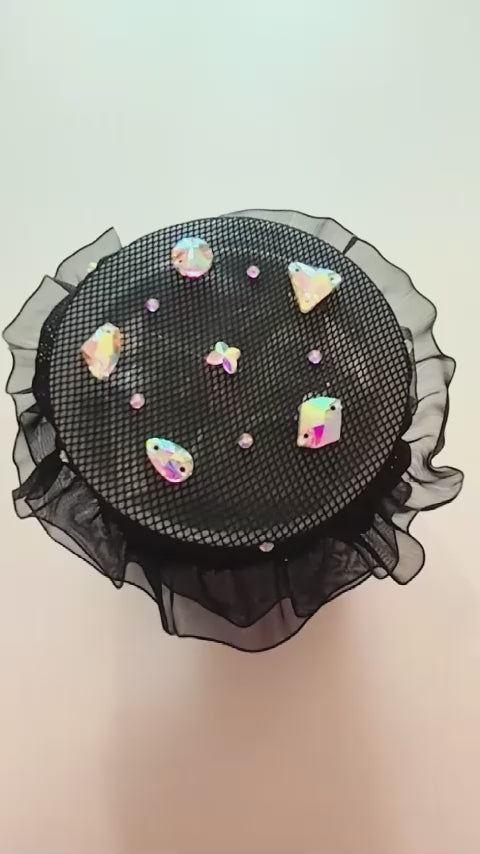 Made with a structured black mesh base, this hair accessory features carefully arranged iridescent crystals in multiple shapes, including triangle, teardrop, oval, and round stones. Each crystal reflects stunning rainbow tones under arena lighting, creating dynamic sparkle with every movement.