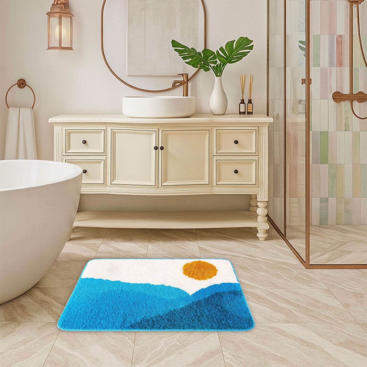 JoySwallow Blue Mountain and Sun Tufted Bathmat, Scenery Bathroom Rug, Landscape Area Rug, Nature Bedroom Rugs